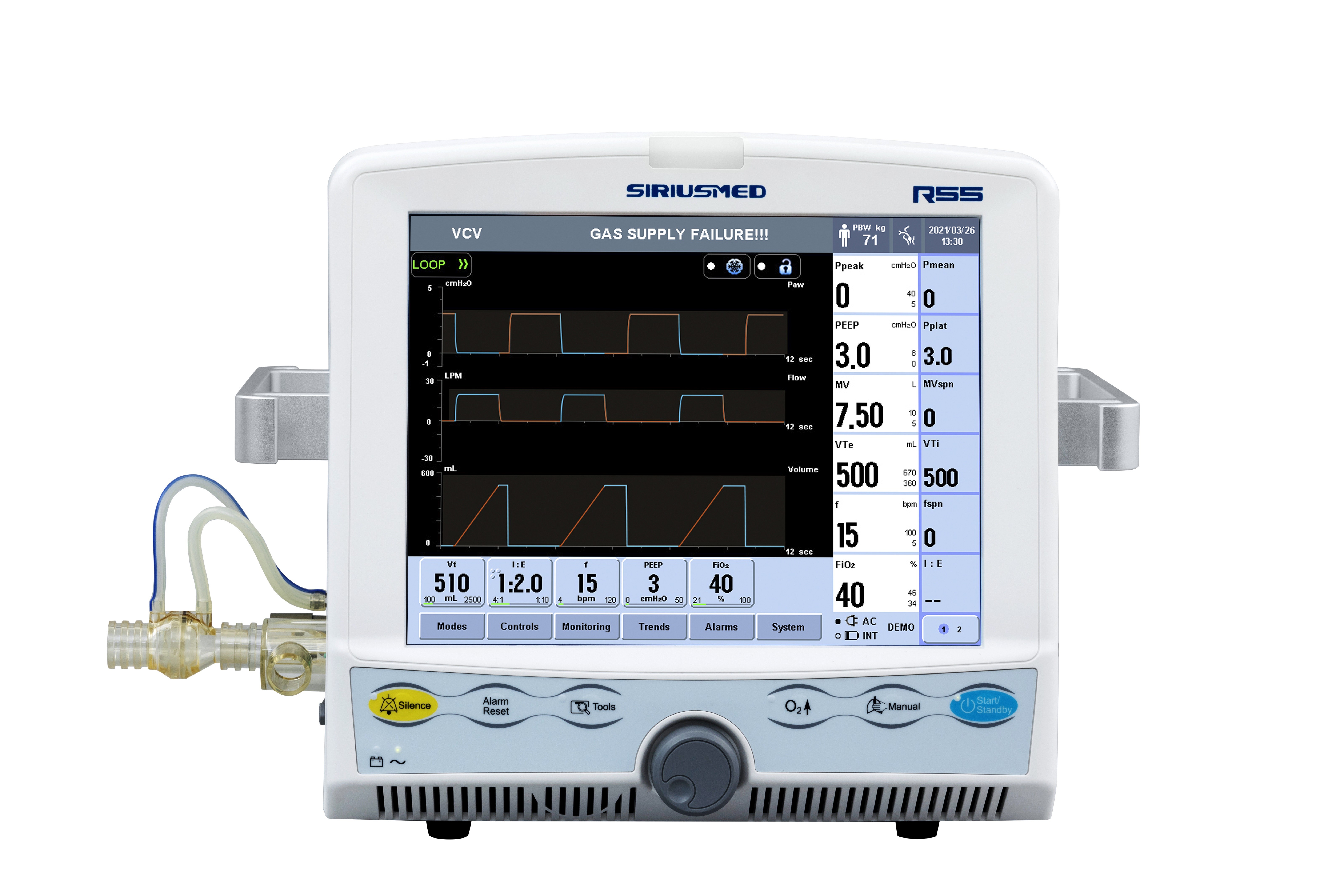 • VCV, PCV, SIMV-VC, SIMV-PC, CPAP/PSV,